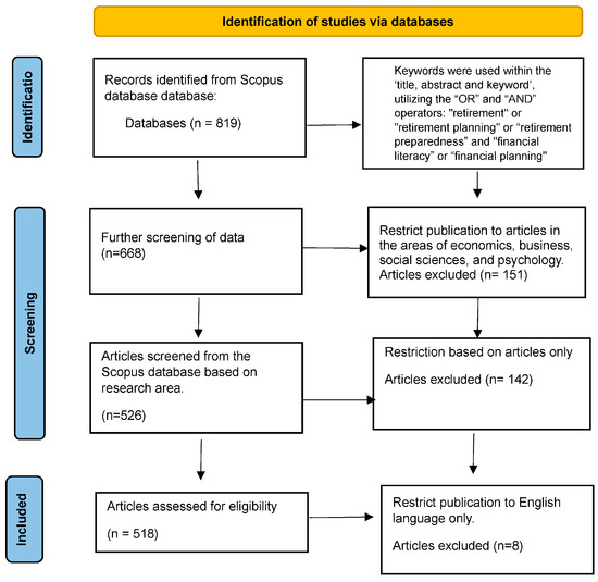 This study used data from the Scopus database from 1970 to October 2024. We chose the Scopus database because of its extensive coverage of articles from both established and emerging journals. This is important as it will minimize any potential biases in article selection. To begin with the data selection for this domain of study, we used the following keywords: “retirement” or “retirement planning” or “retirement preparedness” and “financial literacy” or “financial planning”, resulting in 819 documents. As practiced in bibliometric studies [21,23,24], the PRISMA-based selection criteria are utilized whereby the 819 documents were filtered using the inclusion and exclusion citation criteria. Only articles related to economics, business, social sciences, and psychology were included in the filtering process, thus resulting in 668 documents. Thereafter, documents were further filtered based on “articles only” and those written in “English”. These inclusion criteria resulted in a final corpus of 518 articles. The summarized data extraction is displayed in the PRISMA table in Figure 1.