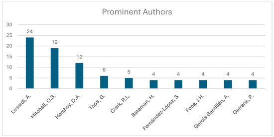 Prominent authors on financial literacy and financial planning and retirements for the period 1970–2024. Source: Authors’ elaboration based on Bibliometrix R-package (Biblioshiny) output.