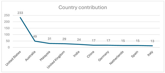 Figure 5 shows the top countries contributing to the scholarly discussion on financial literacy and retirement. The United States leads research contributions on financial literacy and retirement planning with 233 publications, led by the presence of top international researchers in this study domain, specifically Lusardi, A., and Mitchell, O.S. Additionally, there is also a growing need for research on financial literacy and retirement since the United States has diverse financial markets, complex retirement systems (such as 401 (k)s, IRAs, and Social Security) and aging population. Appropriate knowledge, understanding, and awareness of financial literacy are essential as they affect retirement behavior, thus leading to more research on financial preparedness for retirement. Besides the USA, Australia has the second-highest publications on retirement planning globally. The superannuation system in Australia is an essential element of the retirement system, and a high number of publications examine all aspects of the system and its impact on retirement preparedness. Figure 5 indicates that Malaysia, an emerging market, is also contributing actively (31 publications) to scholarly work on financial literacy, financial education, financial inclusion, and retirement-related matters. The active scholarly discussion on retirement-related has contributed to the emergence of the National Strategy for Financial Literacy 2019–2023. The blueprint aims to improve the population’s financial well-being through targeted education and policy interventions. The U.K. is also actively involved in scholarly works (29 publications) on retirement as it has undergone several pension reforms in recent years. The move from traditional defined benefit pensions to more individualized defined contribution plans has created scholars’ interest in the cause and effects of such change on retirement preparedness. As large emerging markets, India and China have also contributed to a high number of research publications in financial literacy and retirement planning. The emphasis is mainly on the importance of financial education and pension reforms for aging and the older generation. Germany, on the other hand, concentrates on scholarly related to the public pension system. The rest of the countries have similar research concentrations as discussed above, i.e., pension fund management, pension reforms, and the need for enhanced financial literacy to navigate retirement planning and preparedness.