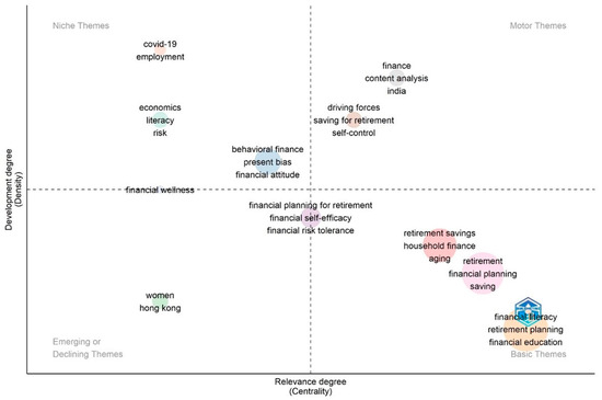 The basic theme is high in centrality but low in density. Themes like “financial literacy”, “financial education”, “retirement planning”, “retirement savings”, and “household finance” are foundational concepts in this quadrant. Due to its centrality, these concepts are highly related and strongly influence other themes that examine broader financial behavior and decision making.