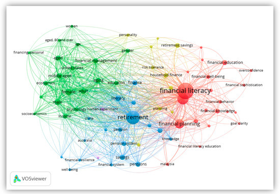 The connected keywords in the blue cluster (Figure 7) are: “retirement”, “pension”, “pension system”, “savings”, “financial resilience”, “literacy”, and “financial knowledge”. The interconnected keywords indicate the correlated effects of financial literacy, knowledge, and pension systems on managing individuals’ retirement preparedness. Financial resilience is also a key factor in determining long-term financial sustainability during retirement.