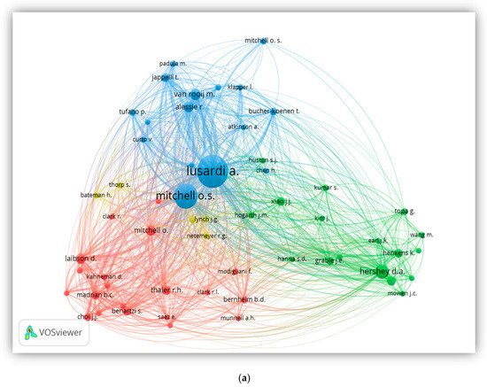 The co-citation analysis [Figure 8a] shows the relationship among authors based on the number of times the authors are cited together in scholarly publications. The network notes that Lusardi A. and Mitchell O.S. are the authorities in this research domain and are frequently cited by most academic journals. Additionally, the clustering of authors in red, blue, and green indicates prominent thematic research groups. The red cluster shows prominent researchers in psychology, such as Kahneman D. and Thaler, and other researchers, indicating that the cluster focuses on research within behavioral finance. The blue and green cluster seems more general, probably a mixture of financial literacy, retirement planning, and preparedness.