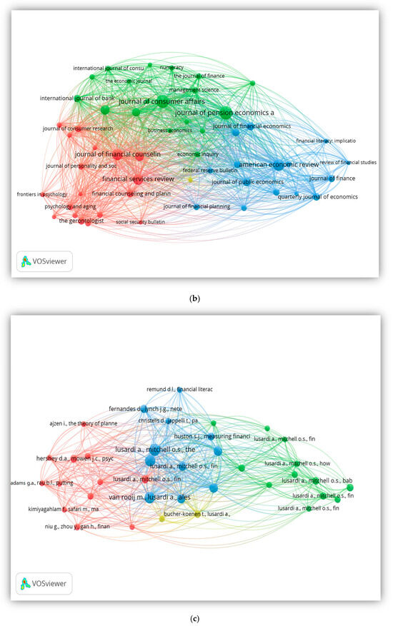 The co-citation analysis of references [Figure 8c] highlights the relationships between key academic references based on how frequently they are cited in scholarly literature. Central nodes like Lusardi A. and Mitchell O.S. indicate that their works are highly influential and frequently co-cited with other authors. The colors represent different clusters of related research themes. The green cluster features Lusardi and Mitchell’s works and likely focuses on financial literacy and retirement planning. The red cluster seems to relate to psychological aspects of financial planning, while the blue cluster likely pertains to financial decision making and literacy measurement. These connections suggest an interdisciplinary approach linking financial literacy, psychology, and retirement planning.