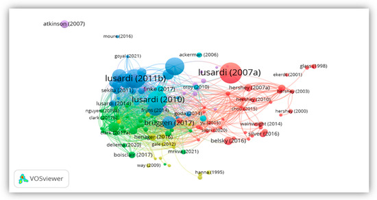 The connected keywords in the blue cluster (Figure 7) are: “financial planning”, “household finance”, “risk tolerance”, and “retirement savings”. The interconnected keywords indicate that this cluster of studies examines the possible impacts of financial planning and household risk tolerance on retirement savings and retirement preparedness in general.