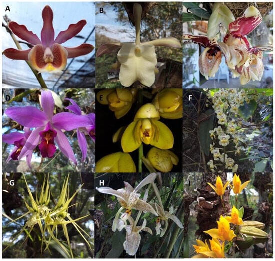 Orchid species included in the survey. From left to right: (A) Myrmecophila grandiflora (Lindl.) Carnevali, J.L.Tapia, and I.Ramírez; (B) Rhyncholaelia glauca (Lindl.) Schltr.; (C) Stanhopea tigrina Bateman ex Lindl.; (D) Laelia anceps Lindl.; (E) Acineta barkerii (Bateman) Lindl.; (F) Trichocentrum stramineum (Bateman ex Lindl.) M.W.Chase and N.H.Williams; (G) Brassia verrucosa Bateman ex Lindl.; (H) Stanhopea oculata (Lodd.) Lindl.; (I) Lycaste aromatica (Graham) Lindl.