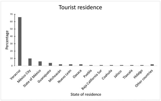 Regarding nationality, 98% were Mexican (Figure 2). The city of Xalapa, Veracruz stood out with the largest number of visitors, at 36%. Concerning the visitors’ tourism habits, 88% said they had vacationed in the last 5 years. The most common type of tourism experience was sun and beach tourism (32%), followed by shopping tourism (25%), and rural tourism (16%). Their average vacation stay was 10.0 days, with an average daily expenditure of MXN 1638.50 (USD 95.63) and a total expenditure of MXN 16,335.0 (USD 953.40) during their trip. On their next vacation, they expect to travel 10.8 days on average and estimate that they will spend MXN 1771.00 (USD 103.36) daily and MXN 17,851.00 (USD 1041.88) for the entire trip. Of the total expenditure, 29% was used for food, 29% for lodging, and 21% for entertainment. The statistical analyses suggest a positive correlation between the length of their vacation stay and the number of kilometers they are willing to travel to learn about these orchids (rs = 0.280; p = 0.008). A positive correlation was also found between the length of their stay and the days they are willing to spend learning about these plants (rs = 0.246; p = 0.021).