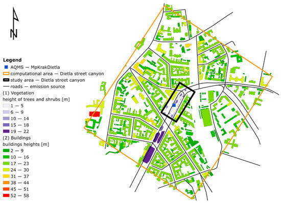- The modelled pollutant concentrations at the MpKrakDietla AQMS site show a much better correlation with the values measured at the MpKrakDietla AQMS than in the case of the similar analyses carried out for the Krasińskiego Avenue street canyon, especially in relation to the variants without vegetation (Table 3—percentage difference);