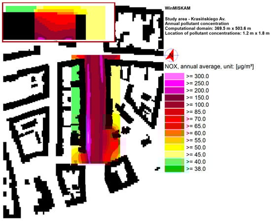 - Krasińskiego Avenue: IOS-FernC70g traffic situation, PM10 emission—approx. 0.033 [mg/(m·s)], NOx emission—approx. 0.27 [mg/(m·s)];