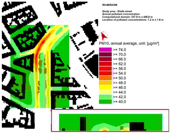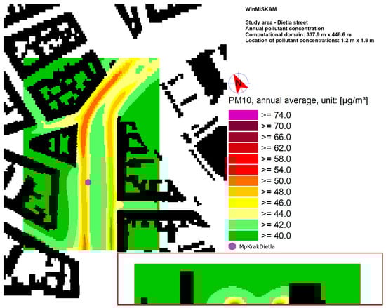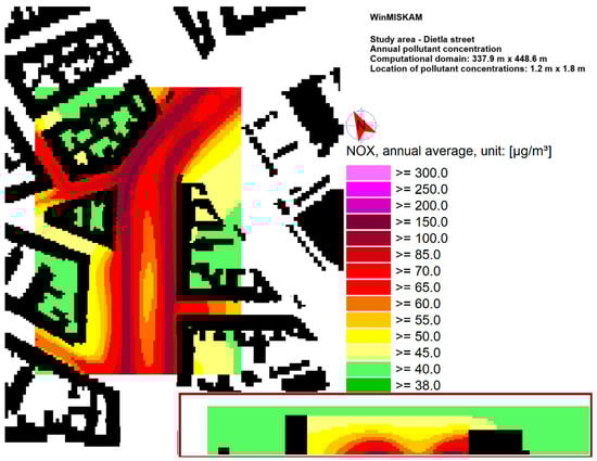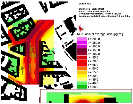 - The average decrease in annual mean PM10 and NOx concentrations at a height of 1.5–1.8 m in the cross-section of the street canyon passing through the MpKrakDietla AQMS was 0.2% and 1.1%, respectively;