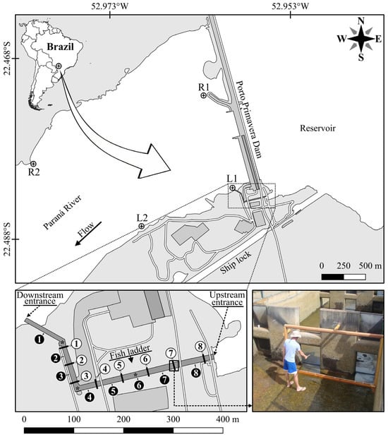 - Makrakis, S.; Makrakis, M.C.; Wagner, R.L.; Dias, J.H.P.; Gomes, L.C. Utilization of the fish ladder at the Engenheiro Sergio Motta Dam, Brazil, by long distance migrating potamodromous species. Neotrop. Ichthyol. 2007, 5, 197–204. [Google Scholar] [CrossRef]