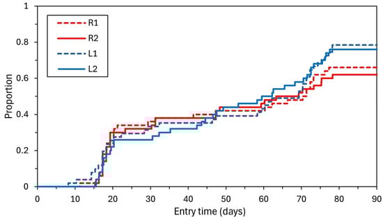 - Castro-Santos, T.; Haro, A. Quantifying migratory delay: A new application of survival analysis methods. Can. J. Fish. Aquat. Sci. 2003, 60, 986–996. [Google Scholar] [CrossRef]