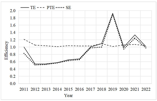 | Time (Year) | Technical Efficiency (TE) | Pure Technical Efficiency (PTE) | Scale Efficiency (SE) | Reward to Scale (RTS) |
