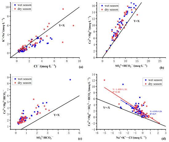 - Groundwater in the study area exhibited weak alkalinity and high hardness. It had a low cation content and high dispersion with noticeable spatial differences. During the wet season, the predominant chemical types of groundwater were HCO3−-Ca and HCO3·Cl−-Ca, whereas during the dry season, it was predominantly HCO3·SO4−-Ca.
