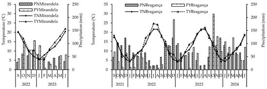 The climate in the regions of Bragança and Mirandela is typically Mediterranean. According to the Köppen classification, Bragança has a Csb climate, while Mirandela has a Csa climate [31], reflecting temperature and precipitation differences between the two regions. In Bragança, the annual precipitation is 772.7 mm, and the average annual temperature is 12.6 °C. In Mirandela, the annual precipitation is 509 mm, and the average annual temperature is 14.3 °C. The climatological normal and meteorological records for the periods under study are presented in Figure 1.