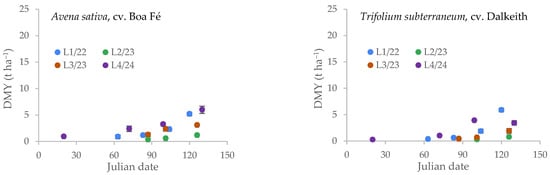 In general, DMY increased from the first to the final cut, except for the two broad bean cultivars, particularly cv. Favel in the L1/22 combination and the subclover in the L4/24 combination. The increase in the DMY over the growth cycle is a direct consequence of the plants’ phenological development and growth, which continued to progress until the final biomass cut, close to full flowering/first pod visible. This outcome aligns with typical findings in studies evaluating the DMY over time [36,37,38]. Under the L1/22 growing condition, the broad beans displayed a low DMY. They exhibited symptoms of leaf burn, possibly due to high soil acidity, with a pH level (4.9) below the recommended range for this species [39,40]. Although limited information is available on the pH adaptability of the cultivars used in this study, the DMY was markedly compromised, with no other apparent cause. It appears advisable for future research to consider this variable, particularly given that soils in Portugal [4,22] and globally [6,7] are predominantly acidic. The subclover used in this study (Dalkeith) is an early-maturing cultivar [41]; therefore, unlike other legumes, it did not fully benefit from the wetter spring of 2024. This year, its peak productivity was reached by the penultimate cut.