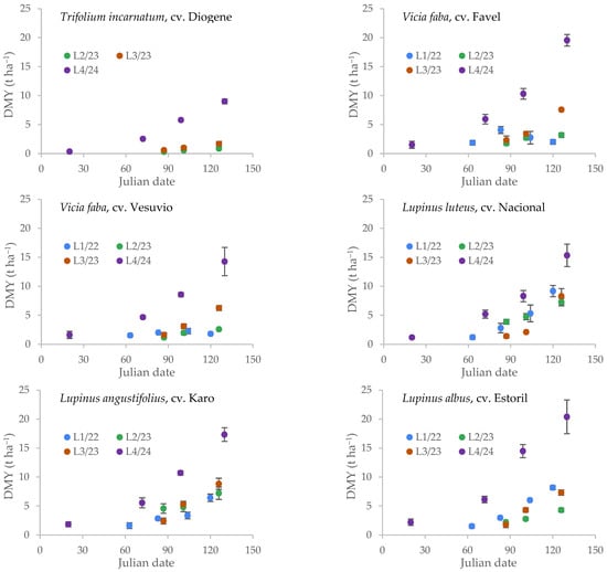 Dry matter yield (DMY) of eight species/cultivars grown under four location/year combinations [Bragança 2022 (L1/22), Mirandela 2023 (L2/23), Bragança 2023 (L3/23), and Bragança 2024 (L4/24)]. The X-axis represents Julian dates (starting from 1 January) to express the dates as a continuous variable. Error bars represent standard deviations (n = 3).