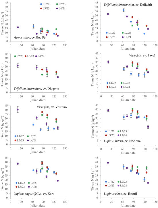 Tissue nitrogen (N) concentrations in eight species/cultivars grown under four location/year combinations [Bragança 2022 (L1/22), Mirandela 2023 (L2/23), Bragança 2023 (L3/23), and Bragança 2024 (L4/24)]. The X-axis represents Julian dates (starting from 1 January) to express the dates as a continuous variable. Error bars represent standard deviations (n = 3).