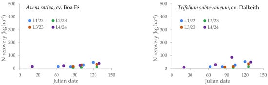 The N recovered in the aboveground biomass was calculated as the product of the DMY and the N concentration in the tissues. The results are presented in Figure 4. The multiplicative nature of this estimation amplifies the differences between the species/cultivars and location/year combinations. However, the general trend of the increasing N content in the aboveground biomass throughout the growing season remains evident, with most of the species/cultivars and location/year combinations showing their highest values in the final sampling.