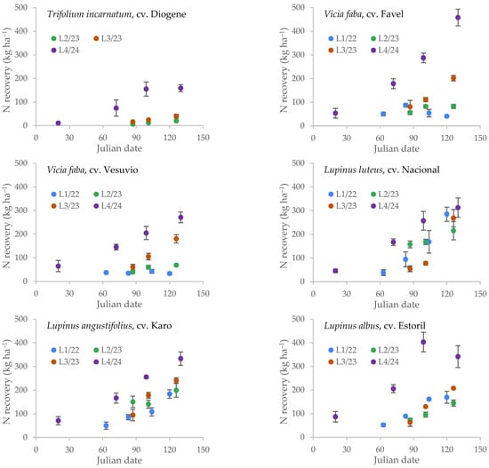 Nitrogen (N) recovery in aboveground biomass in eight species/cultivars grown under four location/year combinations [Bragança 2022 (L1/22), Mirandela 2023 (L2/23), Bragança 2023 (L3/23), and Bragança 2024 (L4/24)]. The X-axis represents Julian dates (starting from January 1) to express the dates as a continuous variable. Error bars represent standard deviations (n = 3).