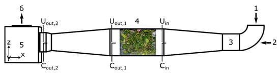 Wind speed measurements were performed with a hot wire anemometer (PCE-009, PCE Instruments, Meschede, Germany, 0.02–20.0 m s−1 at 5% accuracy) at the same positions as the concentration measurements, i.e., before the LWS (Uin), at the end of the test section (Uout,1) and at the end of the wind tunnel (Uout,2).
