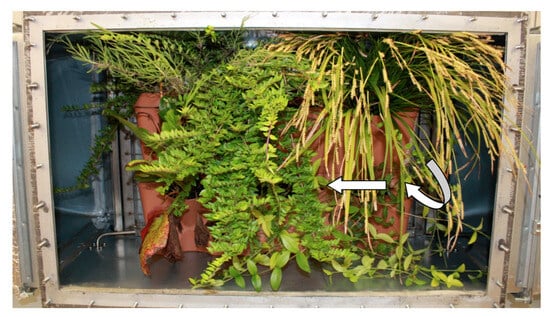 Example of how the LWS setups were positioned in the plant section of the wind tunnel, i.e., parallel to the incoming air stream (going from right to left in the picture and indicated by the white arrows). The LWS on the picture is Planter 1.