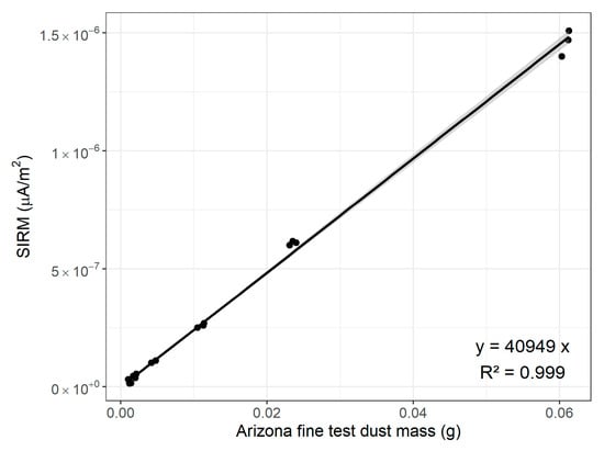 SIRM value (µA m2) of different amounts of Arizona Fine Test dust (g), including a linear regression with its equation and R2 value. Points represent measurements of replicated quantities.