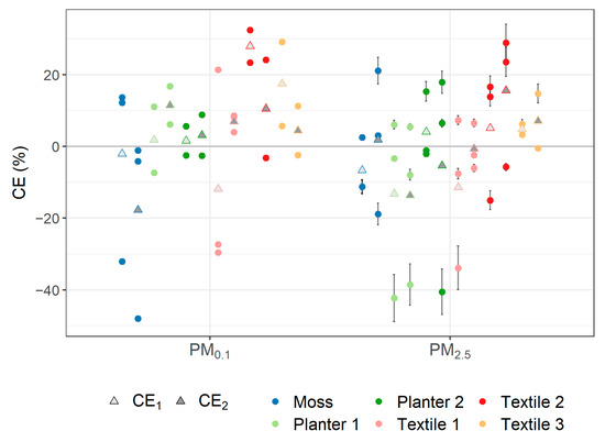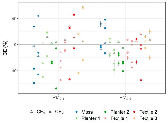 Collection efficiency (%) corrected for an empty wind tunnel for PM0.1 and PM2.5 when placing different types of LWS in the wind tunnel at constant wind speed with PM addition (deposition). Both CE1 between Cin and Cout,1 and CE2 between Cin and Cout,2 are shown. Triangles represent the average collection efficiency, and dots represent those of each experiment separately (n = 2–3).