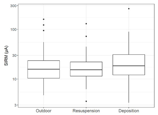 The leaf area-normalised SIRM values of all investigated plant species, setups and treatments varied between 5 ± 1 μA and 260 ± 1 μA (Figure 7). The LMM that correlated SIRM values with plant species, setup and treatment and their interactions showed no significant differences in SIRM values between treatments (p = 0.160). The latter meant that the range of SIRM values of the leaves between the time points before the wind tunnel experiment, after resuspension and after deposition was not significantly different (Figure 7). However, as shown in Figure 6, there was a slight increase after deposition. The plant species did significantly differ in SIRM values (p < 0.001), as demonstrated in Figure 8. On the other hand, SIRM values did not differ significantly among the different setups (p = 0.710); however, there was a significant interaction between plant species and the setup (p < 0.001).