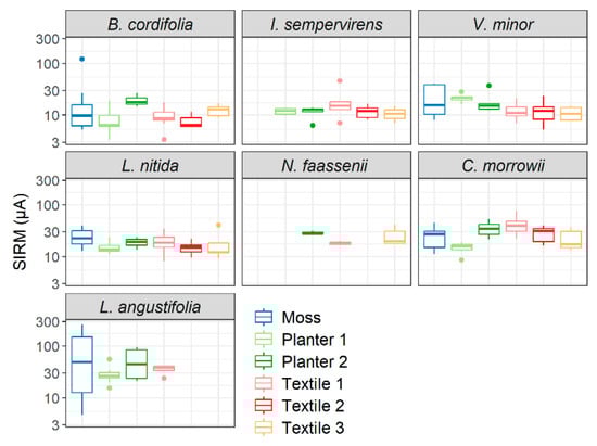 Leaf area-normalised SIRM values (µA), presented on a logarithmic scale, aggregated for all treatments for each tested plant species and for the different setups (Moss, Planter 1–2, Textile 1–3).