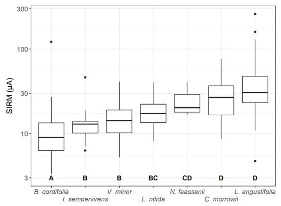 Leaf area-normalised SIRM values (µA), presented on a logarithmic scale, of the different plant species tested, aggregated for all treatments (outdoor, resuspension and deposition) and setups (LWS types from different manufacturers). Letters A–D indicate significant groups (p ≤ 0.05).