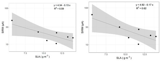 Leaf area-normalised SIRM values (µA), presented on a logarithmic scale, of all tested plant species, averaged for all setups and replicates as a function of specific leaf area (SLA, g m−2) after resuspension (top) and deposition (bottom). The relationship between SIRM and SLA is shown, together with the R2 value.