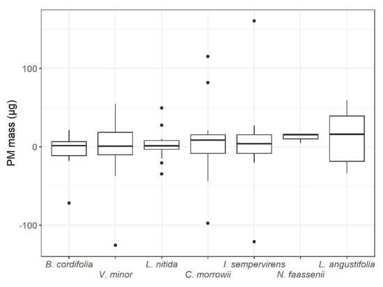 - Chiam, Z.; Song, X.P.; Lai, H.R.; Tan, H.T.W. Particulate Matter Mitigation via Plants: Understanding Complex Relationships with Leaf Traits. Sci. Total Environ. 2019, 688, 398–408. [Google Scholar] [CrossRef]