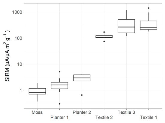 Figure 13 shows area/mass-normalised SIRM values of the LWS supporting structure for all treatments, and the lowest values were found for moss (1.34 ± 0.02 µm m2 g−1), followed by planter (11 ± 1 µA) and textile (467.5 ± 0.7 µA). The LMM confirmed that SIRM values differed between the setups (p < 0.001), and three distinct groups were distinguished, which agreed with the three types set beforehand, namely planter, textile and moss type as the plant supporting structure (Figure 13). However, there was no significant difference between treatments (p = 0.148) and between the interaction of setup and treatment (p = 0.609).