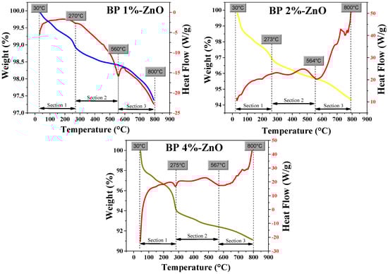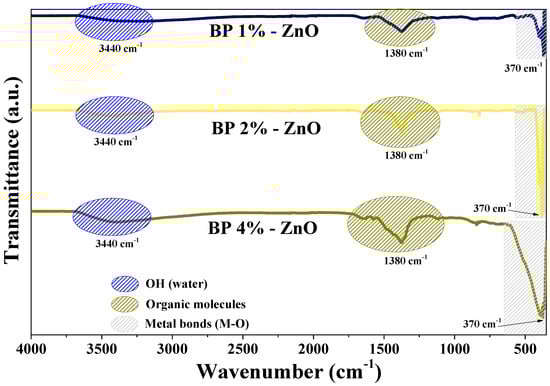 Through an exhaustive analysis of the results obtained, which are shown in Table 1, it can be observed that the BP 4%-ZnO nanoparticles have a greater total weight loss compared to BP 1%-ZnO and BP 2%-ZnO. This outcome aligns with expectations, as a greater concentration of Bromelia pinguin L. extract leads to an increased presence of organic species [46]. It is also possible to observe that by increasing the extract concentration, the stability of the species in Section 1 and Section 2 increases. This may be ascribed to the increased concentration of Bromelia pinguin L. extract used, which results in a greater abundance of organic species. The interaction between these species and the Zn2+ species gives way to a greater formation of ZnO nanoparticles.