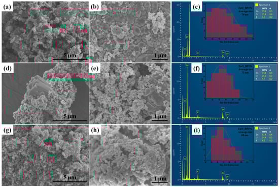 Morphological analysis of the nanoparticles biosynthesized with Bromelia pinguin L. (a,b) Micrographs of BP 1%-ZnO, (c) size distribution of BP 1%-ZnO, (d,e) Micrographs of BP 2%-ZnO, (f) size distribution of BP 2%-ZnO, (g,h) Micrographs of BP 4%-ZnO and (i) size distribution of BP 4%-ZnO.