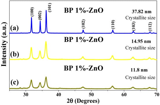 XRD. XRD analysis was carried out on the ZnO nanoparticles biosynthesized with Bromelia pinguin L., to know the diffraction indices and be able to relate them to their crystallinity. As seen in Figure 3, various peaks were presented at 31.74, 34.40, 36.22, 47.49, 56.52, 62.81, and 67.89°. These peaks belong to the indices (100), (002), (101), (102), (110), (103), and (112), respectively. According to the JCPDS card No: 36-145, these diffraction patterns confirm that the nanoparticles exhibit a hexagonal wurtzite structure [37,38]. In contrast, the crystallite size of the nanoparticles of the three most intense peaks presented in the diffractogram [(100), (002), (101)] was obtained following the Debye–Scherrer procedure, using the equation D = 0.9 λ β cosθ [39,40]. When the crystallite size of the three most intense peaks was obtained, an average size was obtained. The results showed a crystallite size of 37.82, 14.95, and 11.8 nm corresponding to the BP 1%-ZnO, BP 2%-ZnO, and BP 4%-ZnO samples, respectively. The crystallite size coincides with the SEM analysis, where it was noted that by increasing the amount of extract used in the biosynthesis, the average diameter of the nanoparticles decreased. This is attributed to the organic molecules in the extract prevent the growth of the nanoparticles by acting as a barrier, preventing agglomeration.