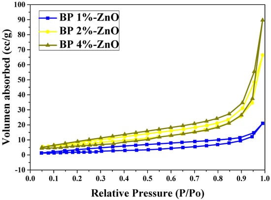 BET. Figure 5 shows the results of BET analysis, indicating that the three types of synthesized nanoparticles present type IV isotherms in accordance with the IUPAC classification. This suggests that the three study samples (BP 1%-ZnO, BP 2%-ZnO, and BP 4%-ZnO) are mesoporous materials, consistent with results shown in previous research [47]. It is noticeable that for the three types of nanoparticles, as the relative pressure increases, the volume of adsorbed gas also increases. This is due to the fact that nanoparticles have sizes on the nanometer scale, and the surface area is much greater compared to micro materials and bulk materials [48]. The volume of adsorbed gas increases following this order: BP 1%-ZnO < BP 2%-ZnO < BP 4%-ZnO. An increased extract concentration results in to an increased presence of organic molecules acting as stabilizing agents, which inhibit agglomeration and growth, resulting in smaller nanoparticles and consequently larger surface areas [49]. The numerical data, summarized in Table 2, confirm these observations. By increasing the concentration of Bromelia pinguin L. extract used, the surface area increases, with BP 4%-ZnO being the nanoparticles with the highest value (21.98 m2/g). As mentioned above, the study samples are mesoporous, and when the pore volume was determined, something similar was observed. The nanoparticles biosynthesized with 4% have a larger pore volume than BP 1%-ZnO and BP 2%-ZnO. Additionally, Table 2 shows that pore size decreases with increasing extract concentration, a phenomenon attributed to the reduction in nanoparticle size [50].