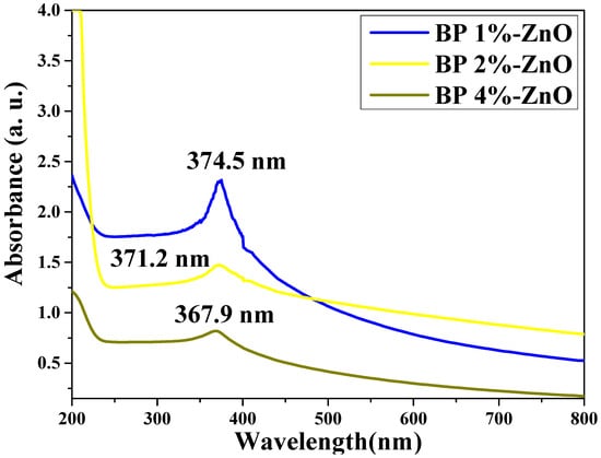 UV–Vis and Band gap. The optical behavior through UV–Vis analysis of the ZnO nanoparticles obtained in this research is observed in Figure 6. The results revealed that the BP 1%-ZnO, BP 2%-ZnO, and BP 4%-ZnO samples exhibited characteristic spectra of ZnO nanoparticles, with absorption peaks observed at 374.5 nm, 371.2 nm, and 367.9 nm, respectively, for the samples synthesized with 1%, 2%, and 4% extract. These peaks are associated with electronic transitions between the valence band and the conduction band. Since no other band is present, it can be ensured that we have pure nanoparticles [51]. This peak can also be used to determine the band gap.