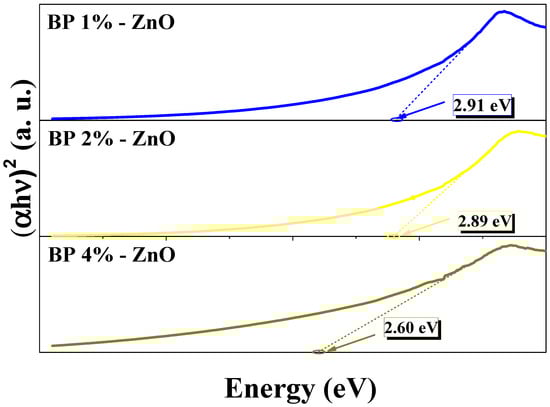 Using the UV–Vis results, the energy gap was determined through the TAUC model. This model analyzes the optical absorbance in relation to energy, following the principles of the Lambert–Beer law [52]. The TAUC model establishes a relationship between the band gap and photon energy [53]. Figure 7 illustrates that the ZnO nanoparticles obtained using 1%, 2%, and 4% of Bromelia pinguin L. extract exhibited lower band gap values compared to commercial ZnO (3.37 eV [54]), which were 2.91 eV, 2.89 eV, and 2.60 eV for BP 1%-ZnO, BP 2%-ZnO, and BP 4%-ZnO, respectively. Comparable results have been documented in the literature, such as the research by C.A. Soto-Robles et al., in 2019, where they presented ZnO band gap values of 2.86 eV, biosynthesizing the nanoparticles with extracts of Hibiscus sabdariffa [27]. Furthermore, in 2023, Sherwan M. et al. obtained values of 2.6 eV in ZnO nanoparticles biosynthesized with Pinus brutia leaf extract [55]. This effect arises from the direct interaction between the synthesized nanoparticles and the organic constituents of the Bromelia pinguin L. extracts. It is possible to obtain some defects in the nanoparticles such as oxygen vacancies [31]. Furthermore, organic molecules like flavonoids and polyphenols in the extract act as photosensitizers [56], causing the band gap to reduce its value. It is worth mentioning that the lower the band gap value, the less energy the semiconductor nanoparticles need to produce the energy jump of their electrons, which is beneficial for the application of photocatalysis.