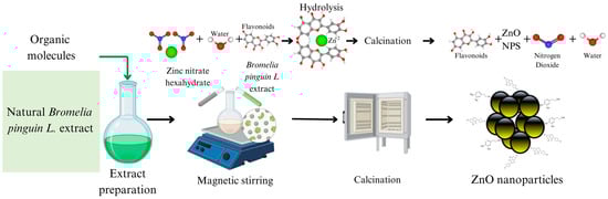 Mechanism of formation of nanoparticles. Figure 8 shows the process of nanoparticle formation using Bromelia pinguin L. as a reducing and/or stabilizing agent. As described in the methodology, first, it is necessary to obtain the natural extract free of impurities (organic material). A specific quantity of zinc nitrate is added to the extract and mixed using magnetic stirring. The biosynthesis involves three key stages: hydrolysis, complexation, and decomposition. Organic molecules in the extract serve as reducing agents, donating electrons from carbonyl groups, leading to the formation of a Zn complex and the reduction of zero-valent Zn2+ ions. Finally, the polycondensation of the Zn complex into ZnO nanoparticles follows [57,58]. As the base of the extract is an aqueous solution, at this moment, a chemical hydrolysis reaction begins, where the original molecule of the metal precursor begins to decompose into smaller fragments [59]. Notably, the organic compounds in the extract can neutralize or bioreduce reactive oxygen species, free radicals, and metal chelates, facilitating the green synthesis process [60]. Subsequently, the solution is given a heating treatment at 60 °C, which causes an acceleration in the decomposition of zinc nitrate, causing a reduction to zinc hydroxide (as shown in Figure 8), and subsequently, nucleation begins, and the growth of the nanomaterial [20]. The next step in the synthesis of the nanoparticles is the heat treatment at 400 °C, where the material begins to crystallize. It is worth mentioning that the molecules of the extract remain interacting at all times, and it has been reported that these molecules become anchored on the surface of the material with interaction with the hydroxyl groups. These organic molecules prevent excessive growth of the material and manage to stabilize them [61,62]. As demonstrated by ATR-IR and EDS analyses, a significant portion of organic molecules remains even after the calcination process, contributing to a reduction in nanoparticle size (see Figure 2), an increase in thermal properties (see Figure 4), an increase in surface area (see Figure 5), and a decrease in the band gap (see Figure 7).