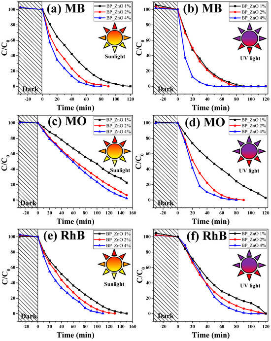 Photocatalytic degradation. The analysis of photocatalytic degradation was carried out under two different conditions: under solar radiation at a temperature of 34 °C and under UV radiation using 10 W reactors. Under these two conditions, the effect of nanoparticles biosynthesized with Bromelia pinguin L. on the degradation of organic pollutants was evaluated. The results are seen in Figure 9. Organic dyes used in various industries have aromatic groups in their structure, making them difficult to degrade naturally. The chromophores responsible for the color of the analyzed dyes include a thiazine ring in methylene blue (MB), an azo group (-N=N-) in methyl orange (MO), and a xanthene ring in rhodamine B (RhB). These chromophores are targeted by active species such as hydroxyl radicals (OH⋅) and superoxide anions (), which break their π-conjugated bonds, leading to molecular degradation and decolorization. Anju Chanu in 2019 reported the elimination of methylene blue under UV radiation, achieving a degradation of less than 2% after two hours of exposure [63]. Similar results were found by Zaid Hamid in 2019, reporting the photolysis of 1% MB for 90 min [64]. On the other hand, the photolysis of MO under UV radiation was reported by Chao Han in 2023, presenting a degradation of approximately 5% in 90 min [65]. Furthermore, Alshamsi. et.al., in 2022, degraded RhB dye under the sun, and no degradation was observed after 300 min [66]. On the other hand, when a photocatalyst material is added, the degradation of pollutants is significantly accelerated. C.A. Soto-Robles et.al. in 2021 used ZnO nanoparticles biosynthesized with Justicia spicigera and degraded 90% of MB under UV radiation in 120 min [67]. Nguyen-Hong et al., in 2021, used Ce-ZnO nanoparticles through an extract of Hedyotis capitellata, managing to degrade 92% of the MO in 240 min under solar radiation [68], and Munir Ahmad et.al., in 2021, used Au-ZnO nanoparticles obtained through green synthesis with Carya illinoinensis extract, degrading 95% of RhB under UV radiation in 180 min [69]. In this work, good results were obtained compared to some reported in the literature. Using different percentages of natural extracts in the formation of nanoparticles allowed the photocatalytic activity to increase. As shown in Figure 9, the degradation of the contaminant increases when using more extract in all the study samples. The degradation in the dark of all the samples analyzed does not represent a significant change in the concentration of the three dyes. The elevated specific surface area of ZnO nanoparticles likely promotes the initial adsorption of dyes, improving their interaction with the photocatalyst during irradiation. However, experiments conducted in the dark showed no significant dye degradation, confirming that adsorption alone is insufficient and that photocatalysis is the primary mechanism. Figure 9a illustrates the photocatalytic activity of MB and it is observed that the three study samples were completely degraded. ZnO_BP1% degraded the MB in 120 min, ZnO_BP2% degraded the MB in 90 min, and ZnO_BP4% was the one that required the shortest time for degradation (50 min). In contrast, Figure 9b presents similar results under UV radiation; as the percentage of extract used increased, the photocatalytic activity increased. The difference is that when UV light was used, the degradation was accelerated due to the difference in energy between the two light sources. Sample ZnO_BP1% and ZnO_BP2% degraded MB in 80 min, and sample ZnO_BP4% achieved degradation in 40 min. In contrast, Figure 9c displays the findings of MO photocatalysis, where it was not possible to eliminate 100% of the contaminant with the three study samples. An effect of the amount of extract used in the biosynthesis is observed, since the degradations were 78%, 93%, and 98% for the samples ZnO_BP1%, ZnO_BP2%, and ZnO_BP4%, respectively, in 150 min of the study. When the analysis was carried out under UV radiation, this contaminant was completely degraded in the three samples (Figure 9d). ZnO_BP1% needed 120 min to achieve complete degradation, ZnO_BP2% degraded in 80 min, and ZnO_BP4% degraded in 70 min. Finally, the degradation of the RhB dye also had satisfactory results. Under sunlight, the three samples allowed the dye to be completely degraded, highlighting that the sample biosynthesized with 4% achieved degradation in 110 min (Figure 9e). Moreover, under UV radiation, this same sample degraded after 90 min (Figure 9f). As observed in the photocatalytic study, the ZnO nanoparticles biosynthesized with Bromelia pinguin L. yielded good results when degrading the dyes under solar radiation. This efficiency is attributed to the organic molecules in the natural extract, which facilitated a decrease in the nanoparticles’ band gap (2.6 eV for the BP 4%-ZnO sample), consequently enhancing their photocatalytic activity. It has been documented that smaller nanoparticle sizes result in a lower band gap, reducing the energy required for the electron’s energy jump and the generation of free radicals essential for the photocatalytic process [70]. Furthermore, nanoparticle size affects the surface area, and an increase in surface area results in more active sites, facilitating the photocatalytic degradation process [71]. These findings demonstrate that employing Bromelia pinguin L. in the biosynthesis of nanoparticles offers significant advantages for the efficient removal of organic dyes, a crucial aspect for their industrial applications. Moreover, the implications of such green synthesis methods extend beyond environmental benefits to positively impact urban habitability. By supporting cleaner water resources and reducing pollutants, these advances in photocatalytic degradation play a crucial role in enhancing quality of life in urban settings, aligning with the goals of sustainable development and improved habitability in densely populated areas. The efficient 