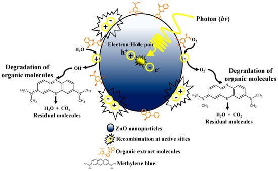Photocatalytic degradation mechanism. Figure 10 shows a proposal for the photocatalysis mechanism of ZnO nanoparticles based on studies by Luis Escobar in 2021 and K.V. Karthik in 2022, among others. The degradation mechanism begins when the ZnO nanoparticle (photocatalyst) biosynthesized with Bromelia pinguin L. is irradiated with energy in the form of light (solar or UV) with a wavelength equal to or exceeding the band gap energy of the semiconductor. When this happens, electrons are promoted from the valence band to the conduction band, generating electron (e−) and hole (h+) pairs, with e− residing in the conduction band and h+ in the valence band [72]. Therefore, the smaller the band gap of the ZnO nanoparticles, the lower the energy required to initiate this excitation and generate the electron–hole pairs. If these pairs avoid recombination and migrate to the nanoparticle surface, they participate in redox reactions with compounds present on the surface. H+ reacts by oxidizing water (H2O) and producing hydroxyl radicals (•OH) [31]. These radicals interact with MB, MO, and RhB molecules, degrading them and generating waste such as H2O and CO2. On the other hand, e− reduces the oxygen (O2) adsorbed on the nanoparticle surface, forming superoxide radicals (O2−•). The O2−• radicals interact with the organic dye molecules, degrading them, generating H2O and CO2 as waste [14].