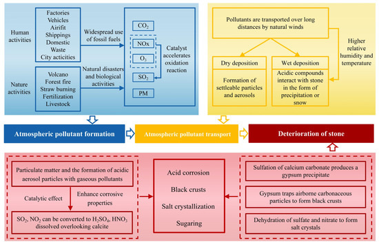 The air pollutants most associated with the decay of calcareous stones include CO2, NOx, SO2, and PM [58]. These pollutants are transported over long distances by natural winds and deposit on the surfaces of buildings or monuments mainly in two ways [59,60].