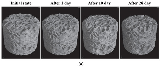 The figures are derived from the acid immersion test results presented in reference [52]. HRXCT analysis was employed to achieve high-resolution observations of microstructural changes in Savonnières limestone during early weathering stages. The Savonnières limestone samples originated from quarries in northeastern France. (a) 3D external visualization of samples prior to and after 1, 10, and 28 days in a mixed acid solution; (b) HRXCT 2D slices at about 1 mm depth, illustrating samples before, after 1 day, and after 28 days in a mixed acid solution.