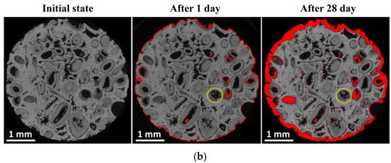 Since the deterioration of stone is a slow process, the corrosive effects of pollutants can be observed through accelerated aging experiments. In a relatively short time, accelerated aging experiments conducted under laboratory conditions provide researchers with insights into how various factors influence material decay in real-world conditions [82]. Silvia et al. (2022) [83] investigated the decay rates of stones by measuring their exposure to immersion in water solutions and wet–dry cycles within an environmental laboratory. The solutions were formulated to closely mimic the composition of local rainwater, with pH levels set at 7 and 6. Material loss in various samples, compared to the original stone surface, was measured to evaluate the effect of rainwater on the stone. Samples exposed to lower pH values consistently exhibited higher average rates of decay. This indicates that the pH level of rainwater significantly affects stone decay. Additionally, the study found that stones with significantly different textural characteristics, particularly calcite grain size, exhibited markedly different decay rates. Finer grain sizes were associated with faster decay, while no clear correlation was observed between stone decay and porosity. The acid corrosion process of stone involves the chemical weathering of internal calcium carbonate, which includes dissolution and the precipitation of new phases [47]. This process was also confirmed in the experiments by Gibeaux et al. (2018) [52], where cylindrical Savonnières limestone samples (4 mm in diameter, 2 cm in height) underwent acid immersion tests with pH controlled at approximately 5 daily to simulate acid-rain-induced stone dissolution. Samples were analyzed after 1, 10, and 28 days. After 28 days, the sample volume decreased by approximately 8.5% in weight (Figure 3a). HRXCT 2D slice visualization revealed differences on the sample surface, showing that all components dissolved gradually with comparable intensity, while new materials precipitated (Figure 3b; red areas indicate the initial material that disappeared, and yellow circles mark crystallization within ooids). Additionally, the mechanical effects of heavy rainfall impacting the surface can cause erosion, while precipitation and wind direction can also affect the geometric shape of surface corrosion on the stone [84].