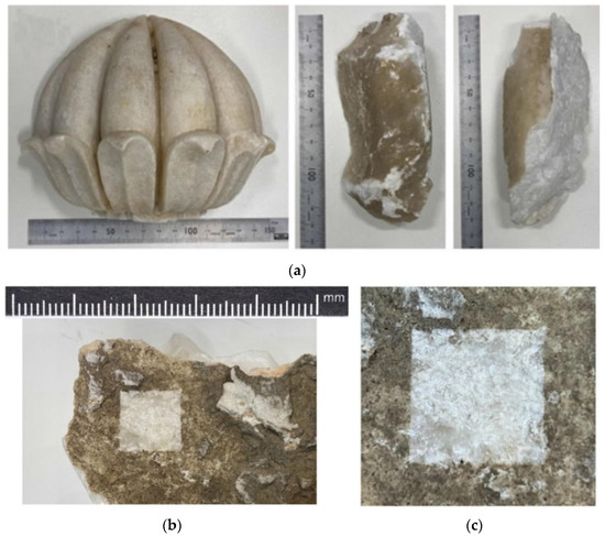 Architectural heritage, with its esthetic, cultural, economic, and social value, has garnered significant attention from the scientific community and is an integral part of today’s world cultural heritage [1,2], Preserving historical buildings and monuments helps sustain humanity’s invaluable cultural heritage [3]. In ancient times, stone was considered to be a timeless construction material. Calcareous stone is well known for its durability, ease of mining [4,5,6], and superior workability and carvability [7,8]. Calcareous stones primarily include limestone and marble. Limestone, a sedimentary rock, forms from the deposition and compression of calcium carbonate-rich materials. Marble is formed from limestone that has undergone metamorphism, a geological process involving intense heat and pressure in the Earth’s crust [8]. The metamorphism modifies the crystalline structure of marble, resulting in a material with greater density and durability. Compared to other stones, limestone and marble are relatively softer, making them easy to cut, shape, and polish. Their workability enables a wide range of applications, including detailed architectural elements, sculptures, and large-scale structural components [9,10], and they are extensively used in the construction of monumental buildings [11,12,13]. For instance, the Taj Mahal in India, an iconic world heritage site, was constructed from white marble [14,15]. Ancient Mayan structures widely employed carbonate material limestone [16], and numerous historic buildings in the Mexico City metropolitan region were built using limestone [17].