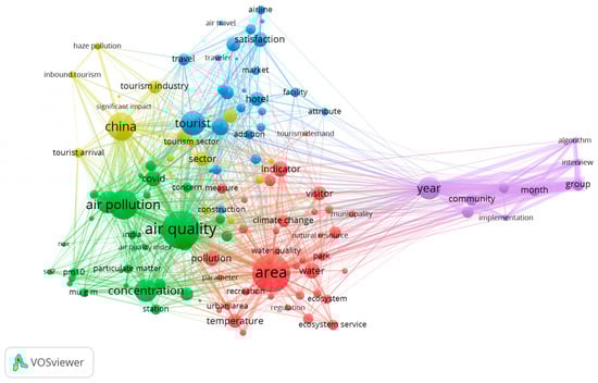 The clustering analysis, visualized through VOSviewer, highlights the distribution and relationships among keywords across five distinct clusters, each representing a specific thematic focus within the research landscape on air quality and tourism. In the network visualizations, node size indicates the frequency of keywords, while link thickness represents the strength of co-occurrence between terms, providing insight into how these themes are interconnected.