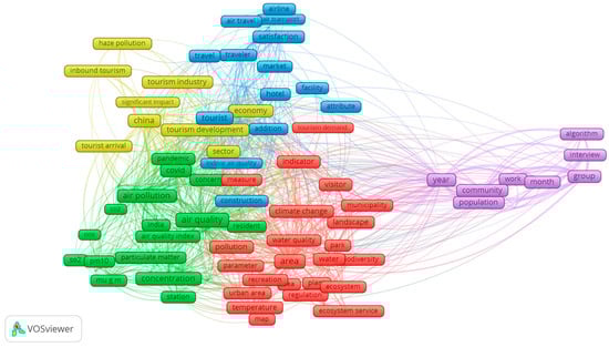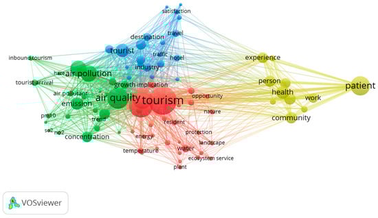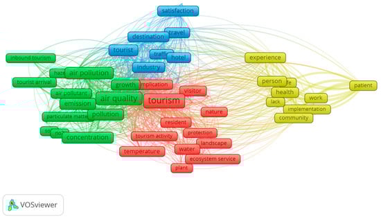 The first VOSviewer network visualization (Figure 4, Figure 5, Figure 6 and Figure 7) presents an exploratory network of keywords associated with air quality and tourism, revealing key thematic clusters. The following four primary clusters are evident: The green cluster focuses on specific air pollutants such as PM10, PM2.5, and emissions, reflecting environmental metrics crucial to assessing air quality. The blue cluster emphasizes tourism-related terms such as “tourist”, “destination”, and “satisfaction”, which are vital for understanding how air pollution affects tourist experiences and decision-making. The yellow cluster connects tourism with health-related terms like “patient” and “community”, underscoring the importance of well-being in pollution-impacted areas. The red cluster links tourism to broader environmental topics, highlighting the ecological impacts of tourism on resources like water and ecosystem services. This thematic clustering reflects the multidisciplinary approach taken in the literature, where tourism, environmental science, and public health intersect to address the complex issue of air quality.