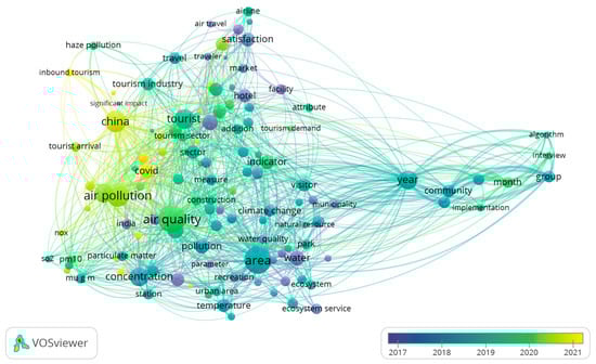 Figure 4 illustrates a temporal visualization of the keyword network in research related to air quality and tourism, using a color gradient to represent the publication years of the articles. The gradient, which ranges from dark blue (2017) to bright yellow (2021), reveals the progression of topics over time, showcasing recent trends and the emergence of new research areas within the field.
