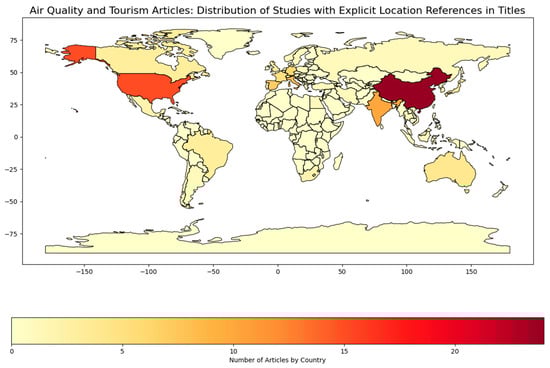 Figure 8 was created using GeoPandas and Matplotlib tools in Python. The dataset includes only articles with explicit location references in their titles, ensuring that each data point corresponds directly to a specific country mentioned in the research. The number of articles per country was calculated based on a comprehensive review of the literature on air quality and tourism, focusing on studies that explicitly link environmental conditions to tourist behavior in defined geographic regions. This approach provides a clear and visually accessible summary of the most researched locations in this field, facilitating a better understanding of regional research trends and priorities.